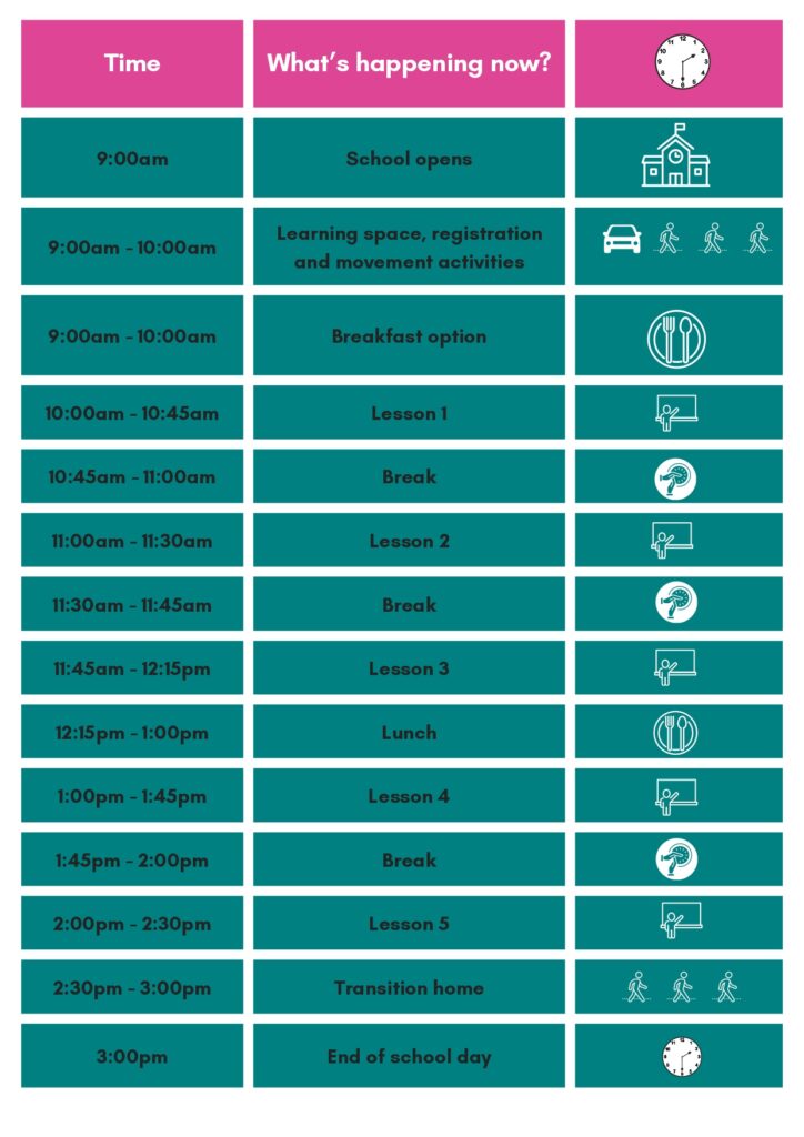 A typical day for our learners is outlined below. On Fridays, the timetable differs at lesson 5 where learners attend Assembly (Together Time), and have optional activities including quiet time or yoga.